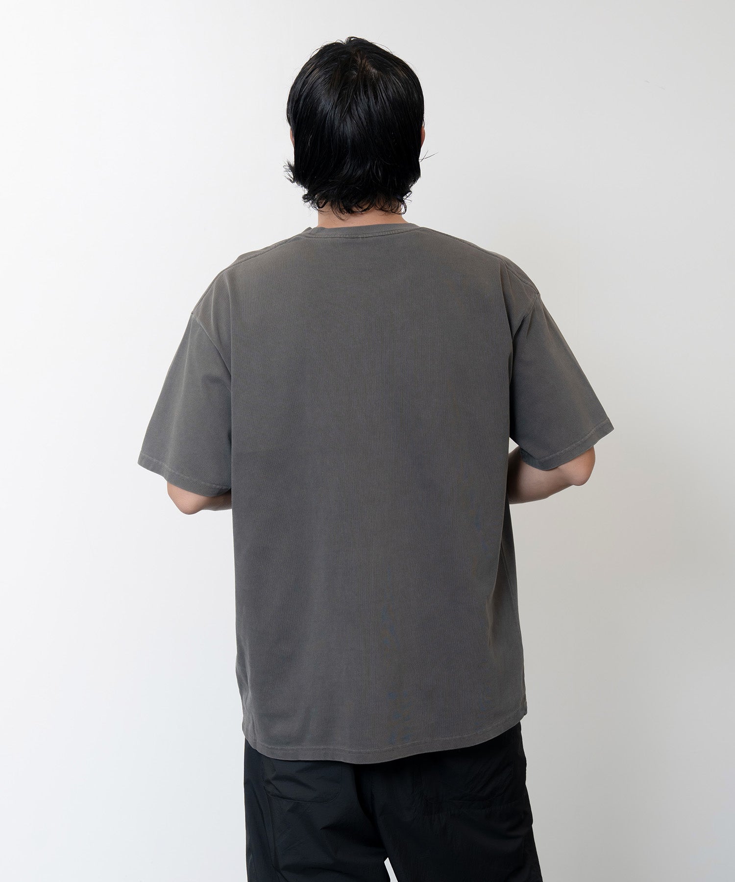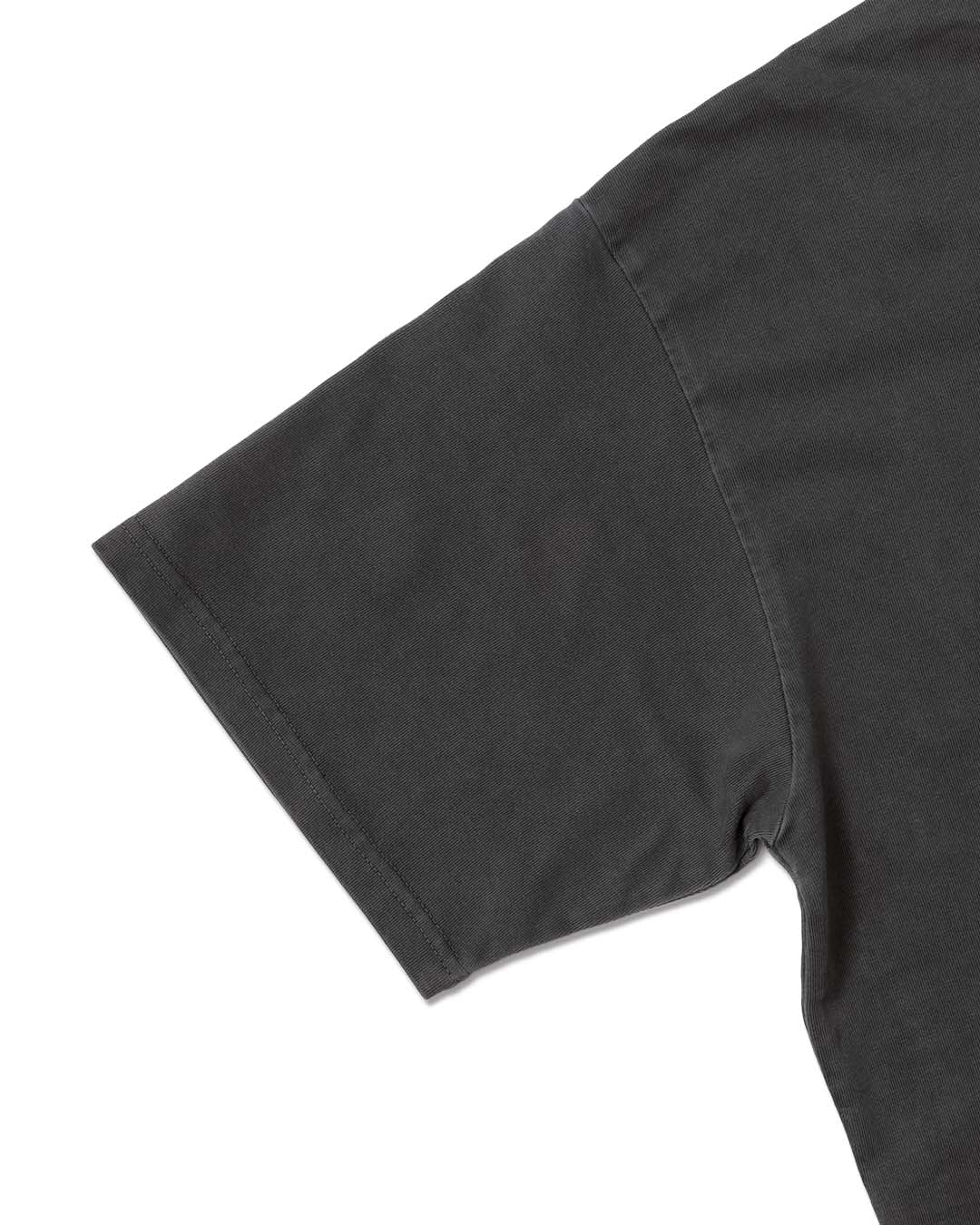 9.5(285g)オンス (26/2 双糸) のオリジナルヘビー天竺に、ピグメント加工を施した半袖Tシャツです。天竺では珍しい26番手の端番手を双糸で編むことにより、厚手でビンテージ感のある表情と風合いがあり、更に斜行しにくいのが特徴です。ピグメント加工とは、あらかじめ特殊な溶剤などで処理を行った生地に、本来はプリントに用いられる顔料を製品の内部まですべてを染めるのではなく、繊維の奥まで浸透させず、生地の表面のみに色をのせて染色する加工技術です。(別名=ピグメントダイ)1枚1枚加工の風合いが若干異なり、着用や洗濯を繰り返すことで徐々に色落ち、ヴィンテージ感の経年変化を楽しめるのが特徴です。